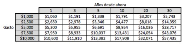 ¡No se asuste! En verdad es fácil usar esta tabla. Vamos a asumir que usted quisiera saber cuánto le costará mensualmente en el futuro mantener su estilo de vida actual. Para calcular esto, nada más tiene que buscar lo que gasta mensualmente en la fila de "Gasto" y en la columna de "Años desde ahora" eligir la cantidad de años en el futuro que quisiera proyectar. Por ejemplo, si usted tiene gastos mensuales de $5,000 por mes y quisiera saber cuánto le costará mantener su estilo de vida en 20 años, la tabla indica que el monto es de $16,036. ¡Esto significa que si una persona en el año 2032 gasta $16,036 por mes que tendrá el mismo estilo de vida que una persona de $5,000 por mes hoy en día!